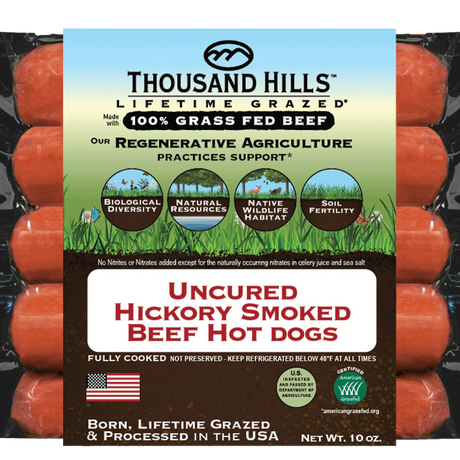 These Uncured Beef Hot Dogs are produced by Thousand hills, a collection of producers that are located throughout the US. All ranchers have implemented holistic, regenerative land and grazing practices. They don't use GMOs, glyphosate (Roundup), excessive tilling, etc. Instead, they regenerate topsoil, re-establish diverse grasslands, and always holistically graze and manage their cattle. They don’t follow the crowd. Instead, they swim upstream to understand the implications of their decisions. In short, they are making decisions to improve their land today and tomorrow for future generations. They know their title of ‘Land Steward’ carries a responsibility bigger than themselves.