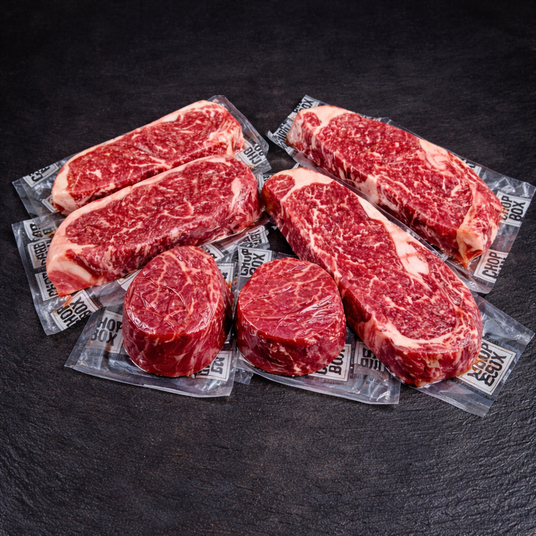 Each steak box features a classic mix of ribeye, New York strip, and filet mignon.